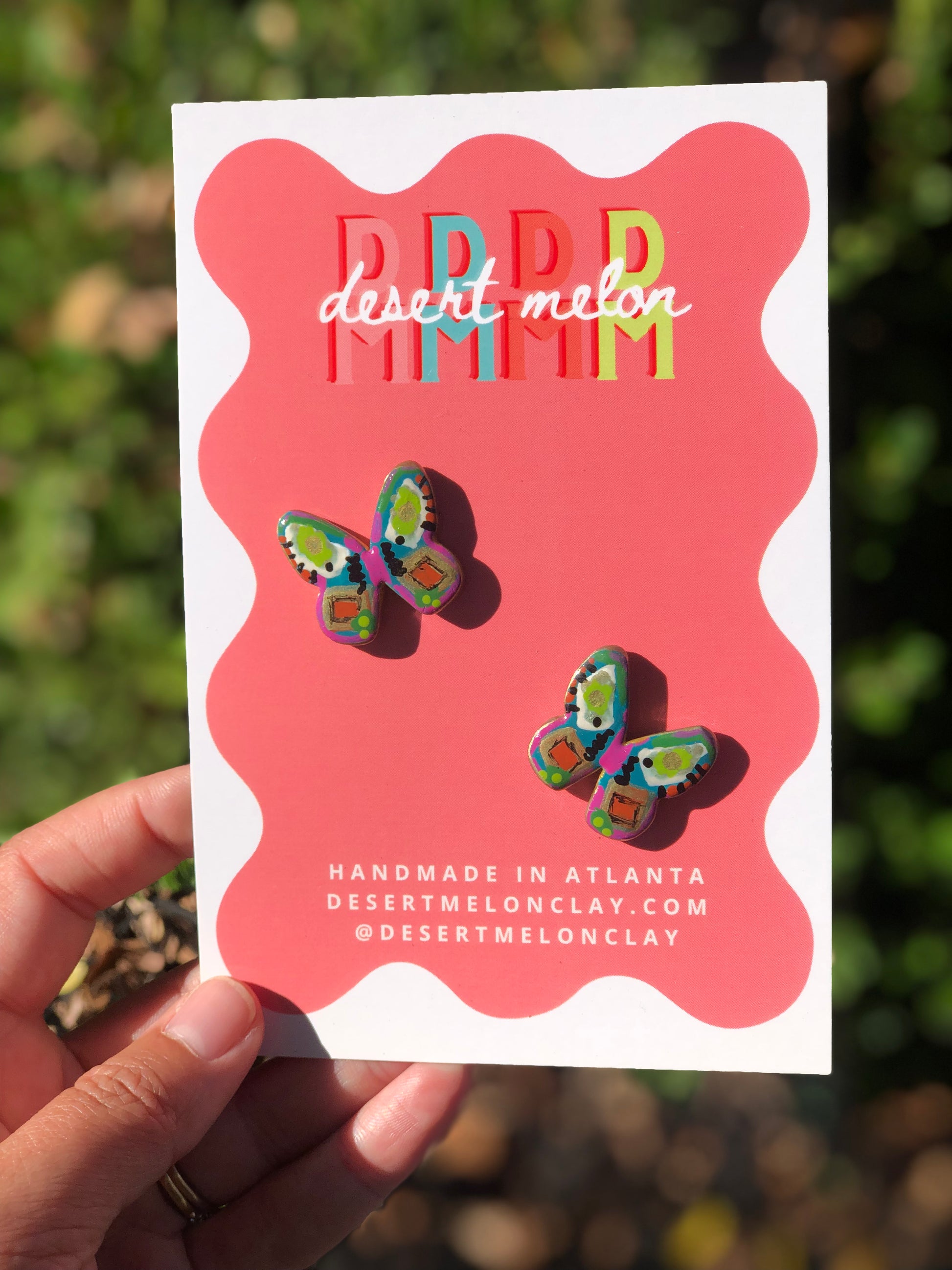 Hand-painted and one-of-a-kind these butterfly studs are sure to make a statement! Finished with gold-plated stainless steel posts.