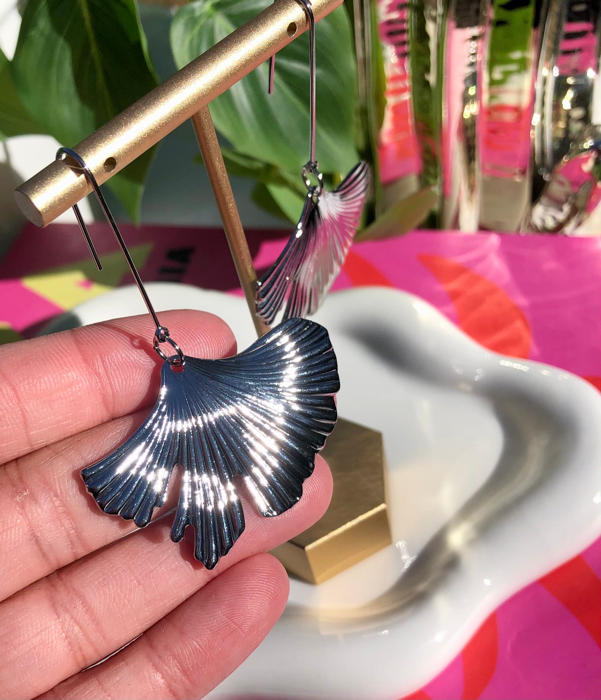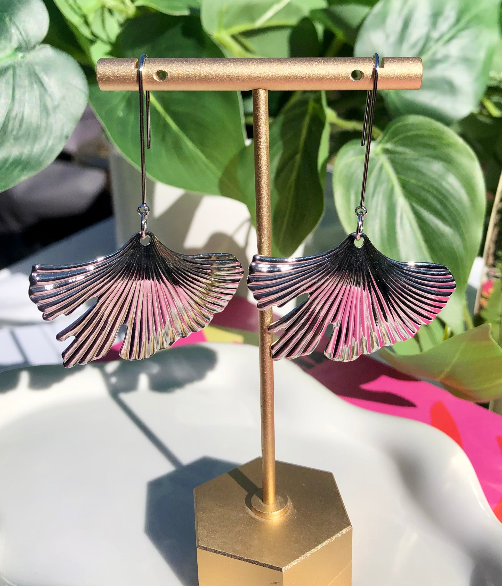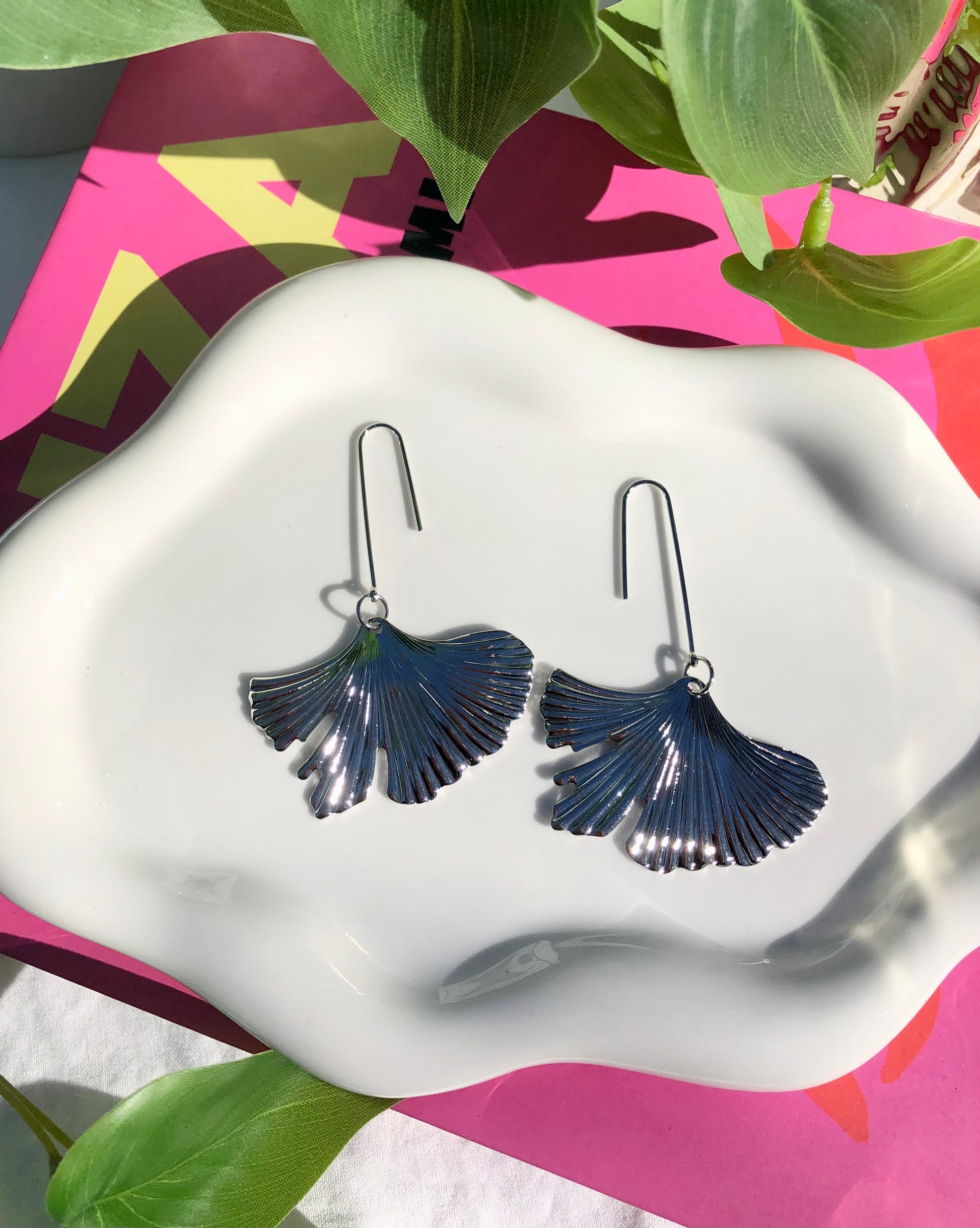 Lightweight rhodium-plated ginkgo leaf with stainless steel post.